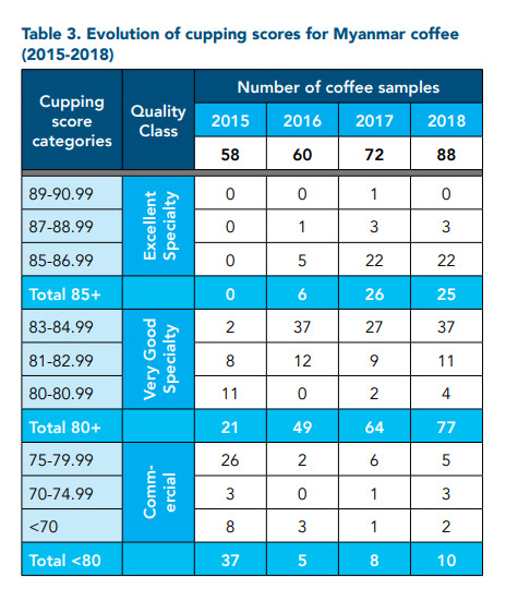 - The first specialty grade coffee was exported from Myanmar in 2016 - just 36 Metric Tons / 2 containers.